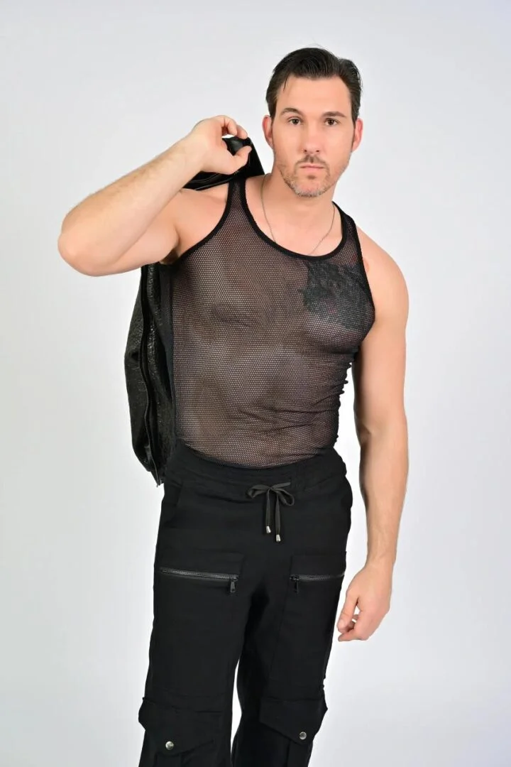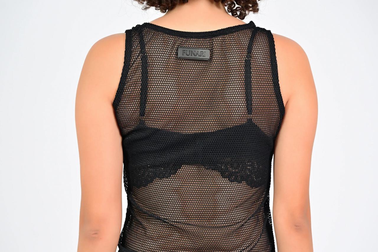 Sheer Mesh Transparent Scoop tank top Unisex style. Great to wear to work out in gym or to the club! Made from nylon recycled from bottles. Made in New York City.